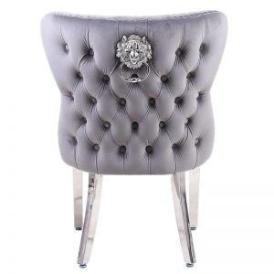 The plush Velvet Knockerback dining chair is sure to impress thanks to stylish chrome legs and metal studding around the back and seat. The chair which is upholstered in a plush velvet also has a very stylish door style knocker on the back of each chair, so the chair looks as good around the table when not in use. The chair has metal studding around the seat and back and complements the knockers beautifully